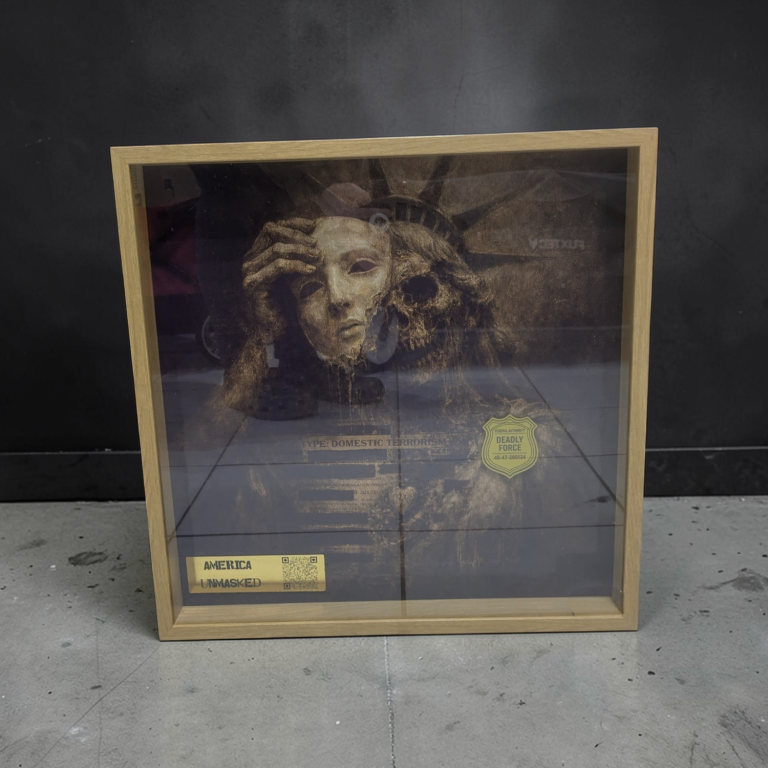 "America Unmasked" untersucht die Fragilität politischer Symbole im Spannungsfeld zwischen Anspruch und Wirklichkeit. Im Zentrum steht Lady Liberty, die sich selbst entlarvt, indem sie eine starre Maske abnimmt und darunter ein verwittertes, nahezu skelettartiges Gesicht freilegt. Die ikonische Figur verliert ihre Funktion als unverrückbares Zeichen von Freiheit und wird zum Ausdruck eines Zustands, in dem Bedeutung brüchig geworden ist.