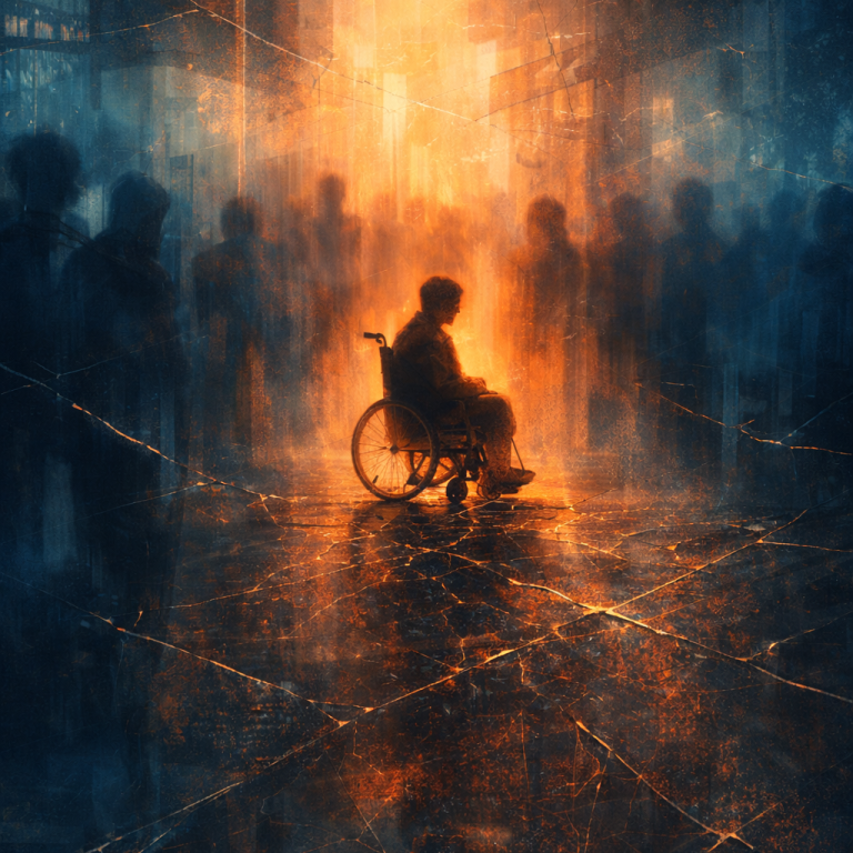 Im Zentrum des Werks steht eine Figur im Rollstuhl, ruhig und in warmes Licht getaucht. Die umgebende Masse bleibt diffus, kühl und perspektivisch instabil. Feine strukturelle Risse durchziehen den Raum. Es wurde bewusst darauf verzichtet, die Figur als Bruch darzustellen. Der Bruch liegt im Raum selbst – in der Architektur des Blicks.